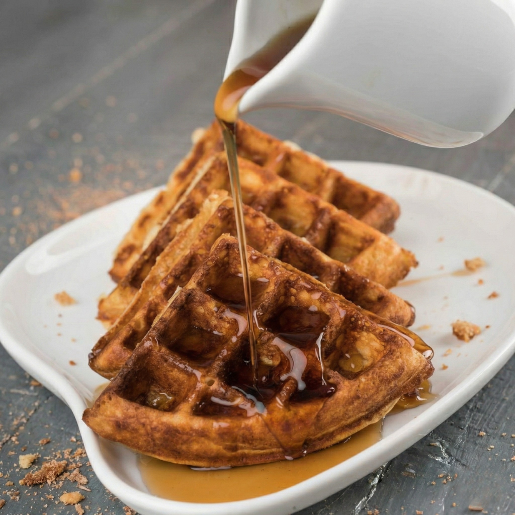 Golden, perfectly crisp waffles topped with toasted pistachio crumbs and a delicate drizzle of creamy white chocolate. Soft and tender inside, each bite delivers a subtle nutty crunch balanced with gentle sweetness—an elegant and indulgent treat for any time of day.